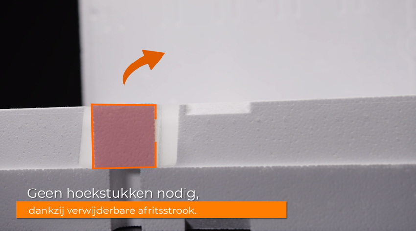 4. Geen aparte hoekstukken nodig. Hoeken zijn zeer eenvoudig met normale bodemplaten en zijwanden te maken dankzij eenvoudig verwijderbare afritsstrook.